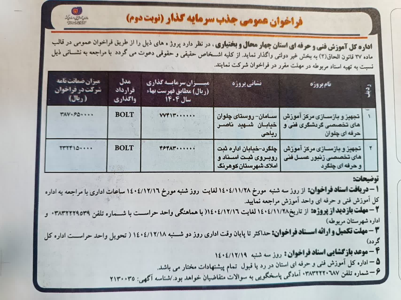 اداره کل آموزش فني و حرفه اي استان چهارمحال وبختياري ،در نظر دارد تجهيز و بازسازي مرکز آموزش هاي تخصصي گردشگري فني و حرفه اي چلوان،تجهيز و بازسازي مرکز آموزش هاي تخصصي زنبور عسل فني و حرفهاي چلگردرا از طريق فراخوان عمومي در قالب ماده ۲۷ قانون الحاق(۲)به بخش غير دولتي واگذار نمايد.